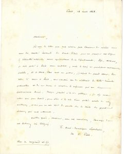 Paris 18 mars 1848, à Victor Injod, propriétaire, au château de Soultzmatt (Haut-Rhin). Il est déjà candidat à l'Assemblée nationale, à Paris, «mais le succès ne paraissant aucunement probable, si le Haut-Rhin veut me porter, j'y consens de grand coeur. [...] mon intention est de m'abstenir de toute démarche personnelle [...] Étranger jusqu'ici à la vie politique, je n'y veux entrer que par devoir, pour obéir à la voix d'une portion notable de mes concitoyens, et non par un vain désir de paraître sur le théâtre des grands événemens qui nous entourent»...