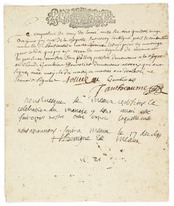 “Nous Evesque de Meaux certifions la celebration du mariage cy desus avoir esté fait et par nostre ordre exprez laquelle nous approuvions.”