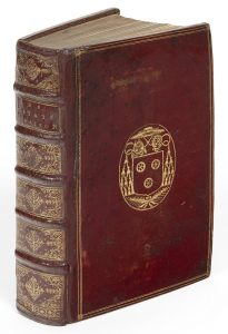 Maroquin rouge, triple filet doré et armes dorées au centre sur les plats, dos à nerfs orné, roulette dorée intérieure, tranches dorées sur marbrures (reliure de l' époque).