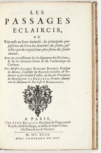 • BOSSUET (Jacques Bénigne). Les Passages éclaircis, ou Réponse au livre intitulé : les principales propositions du livre des Maximes des saints, justifiées par des expressions plus fortes des saints auteurs. Avec un avertissement sur les signatures des Docteurs, & sur les dernieres lettres de M. l'Archevesque de Cambray.