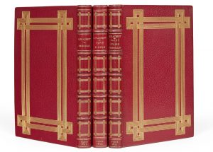 Maroquin rouge, plats ornés d'un encadrement doré composé de quatre larges rectangles de sept filets dorés s'entrecroisant aux angles, dos à nerfs orné dans le même esprit, quintuple filet doré intérieur, tranches dorées, couverture et dos conservés (M. Lortic).