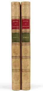 Quelques traces de mouillures claires sur les plats, sans gravité. Restauration à l'angle supérieur du faux titre du premier volume et à l'angle inférieur du feuillet M2 dans le second volume.