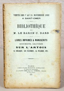 (CATALOGUE DE VENTE PUBLIQUE). Vente des 7 au 15 novembre 1892 à Saint-Omer. Bibliothèque de M. le baron C. Dard. Livres & manuscrits, documents, gravures sur l’Artois, la Belgique, les Flandres, la Picardie, etc.. Paris et Saint-Omer, 1892.