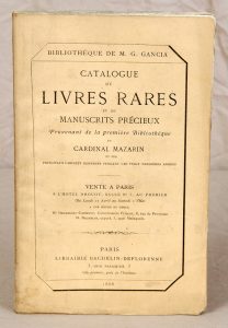 (CATALOGUE DE VENTE PUBLIQUE). Catalogue de livres rares et de manuscrits précieux, provenant de la première Bibliothèque du cardinal Mazarin ... Bibliothèque de M. G. Gancia. Paris, Bachelin-Deflorenne, 1868.