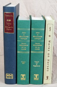 • LA TORRECILLA (Marquis de). Libros escritos o tratados de equitation, jineta, brida, albeiteria, etc... Indice de Bibliografica Hipica Española y Portuguesa, catalogada alfabeticamente por orden de autores y por orden de titulos de las obras. Madrid, 1916-1921 (Réimpression, 2000). In-4, V-441 pp. toile de l'éditeur. Importante et précieuse bibliographie (elle était devenue introuvable).
