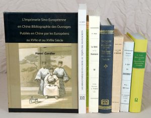 • CORDIER (Henri). L'imprimerie sino-européenne en Chine. Bibliographie des ouvrages publiés en Chine par les européens au XVIIe et au XVIIIe siècle. Paris, Leroux, 1901. (Réimpression, 2009). Grand in-8, ix-73 pp. + (1) f., cartonnage illustré de l'éditeur. Cordier est parvenu, après bien des recherches, à trouver et décrire 395 publications européennes sorties des presses installées en Chine. Texte sur 2 colonnes. Figures.