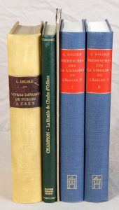 • DELISLE (Léopold). Recherches sur la librairie de Charles V (1337-1380), roi de France… et Inventaire des livres ayant appartenu à Jean de Berry… Avec addition et description des planches. Paris, 1907 (Réimpression, 1967). 2 volumes in-8 totalisant 825 pp. toile de l’éditeur.