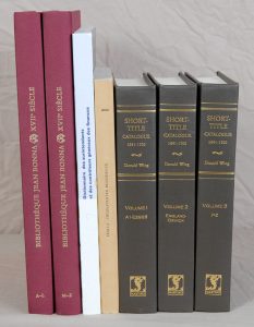 (XVIIe siècle). WING (Donald). Short-title of Books printed in England, Scotland, Ireland, Wales and British America and of English books printed in others countries 1641-1700. Columbia University Press, 1945-1951 (Réimpression, 1999).