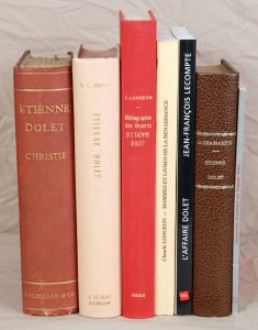 • LONGEON (Claude). Bibliographie des oeuvres d'Étienne Dolet, écrivain, éditeur et imprimeur. Genève, 1981. Grand in-8, (2) ff + LXXVII + 213 pp. toile rouge de l'éditeur. La bibliographie de référence. Elle est illustrée de reproductions dans le texte.