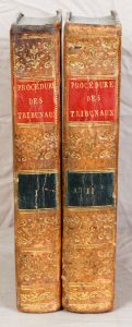 2 volumes in-4, (2) ff + 716 pp. et (2) ff + 784 pp. + 92 pp. (code de procédure civile), demi-basane fauve, dos lisse décoré avec pièces de titre et de tomaison de maroquin rouge et vert. (Reliure de l’époque).
