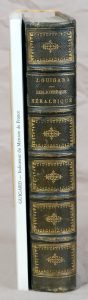 « Sous le titre de Bibliothèque héraldique le travail que nous livrons à la publicité comprend la nomenclature systématique et raisonnée des ouvrages qui ont paru sur le Blason, Les Ordres de Chevalerie, la Noblesse, les Fiefs, la Féodalité et les Généalogies relatifs à la France». Petite auréole claire dans la marge supérieure et des rousseurs ».