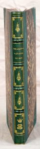 In-8, (2) ff + XXXII pp. + 163 pp. (la pagination passe de 144 à 149 sans manque de texte), demi-chagrin vert à coins, tranches rouges, dos à nerfs décoré, avec en pied un chiffre doré couronné.