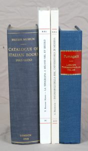 • FUMAGALLI (Guiseppe). Lexicon Typographicum Italiae : Dictionnaire géographique d'Italie pour servir à l'histoire de l'imprimerie dans ce pays. Florence, 1904. (Réimpression, 1998). In-8, XLVII + 587 pp. toile de l'éditeur. Précieuse étude qui donne pour chaque ville d'Italie, l'histoire de l'apparition de l'imprimerie. On y trouve la description bibliographique savante et détaillée, avec indice de rareté, d'un millier d'impressions parmi les plus remarquables, des notices biographiques sur les plus éminents typographes. Illustrations.