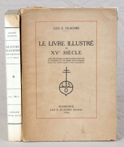 • OLSCHKI (Leo S.). Le Livre illustré au XVe siècle. Avec 344 figures sur 220 planches dont une en couleurs et 3 en bistre, plus 15 figures dans le texte dont 2 en couleurs. Florence, 1926. In-8, XL + 80 pp. + 220 planches, broché.