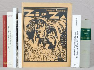 • PICALAUSA (Louis-C.). Zi et Za. Histoires pour les enfants de 9 à 99 ans. Courbevoie, Éditions La Flamme, 1935. In-4, (118) pp. broché, couverture illustrée. Avec 73 illustrations, frontispices, lettrines, culs-de-lampe et linos de l'auteur et de 2 dessins de Rosemary.