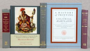 • WROTH (Lawrence C.). A History of Printing in Colonial Maryland. 1686-1776. Baltimore, 1922. (Réimpression, 2010). In-4, (1) f + XIV pp. + (1) f + 275 pp. cartonnage illustré de l'éditeur. Après un long préambule sur les débuts de l'imprimerie et les tous premiers imprimeurs du Maryland, on trouve la description, avec collation détaillée, le plus souvent commentée, des 393 livres publiés dans la période considérée. Planches comprises dans la pagination.