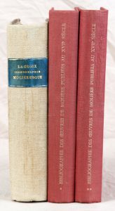 • LACROIX (Paul). Iconographie moliéresque. Seconde édition, revue, corrigée et considérablement augmentée. Paris, Auguste Fontaine, 1876. In-8, (2) ff XLIII + 392 pp. + 12 pp. : extrait du catalogue de la Librairie du Bibliophile, bradel demi-toile grise à petits coins, couverture conservée. Exemplaire numéroté sur hollande. L’auteur décrit 830 + 184 pièces qu’il commente parfois très longuement. Importante table des noms. Frontispice gravé.