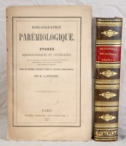 • DUPLESSIS (P. A.). Bibliographie parémiologique. Études bibliographiques et littéraires sur les ouvrages, fragments d'ouvrages et opuscules spécialement consacrés aux proverbes dans toutes les langues, suivies d'un appendice contenant un choix de curiosités parémiologiques.