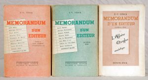 STOCK (P. V.). Memorandum d’un éditeur (Première), deuxième et troisième série(s). Paris, Stock, 1935-1938 .