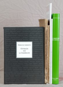 • LHERMITTE (E.). Ouvrages sur la Champagne. Contribution à la bibliographie champenoise. Paris, 1992. In-8, (4) ff + III + 259 pp. broché. Catalogue de libraire (liste des prix jointe) où sont décrits 1588 livres et documents. Des index en rendent la consultation agréable.