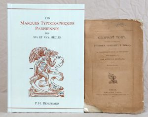 • RENOUARD (Philippe). Les Marques typographiques parisiennes des XVe et XVIe siècles. Paris, Champion, 1928. (Réimpression, 2003). In-8, (2) ff + VIII + 381 pp. cartonnage illustré de l'éditeur.