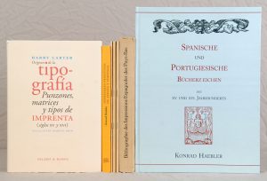 • HAEBLER (Konrad). Spanische und Portugiesische Bücherzeichen des XV und XVI Jahrhunderts. Strasburg, Heitz, 1898 (Réimpression, 2011). Grand in-4, (3) ff + XL + 47 pp. + XLVII planches, cartonnage illustré de l'éditeur. Grand spécialiste des origines de la typographie dans la péninsule ibérique, le bibliographe allemand répertorie ici les marques d'imprimeurs et divers ornements typographiques qui sont reproduits sur 47 planches.