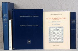 • NORTON (F.-J.). Descriptive catalogue of printing in Spain & Portugal. Cambridge, Cambridge University Press, 1978. (Réimpression, 2000). Grand in-8, XXIII + 581 pp. toile de l’éditeur. Cette bibliographie répertorie les ouvrages publiés de 1501 à 1520. Le classement choisi est géographique et par imprimeur, avec une biographie, la reproduction des marques utilisées, etc… pour chacun des imprimeurs. Tous les livres connus sortis de leurs presses (environ 1400) pendant la période considérée sont décrits avec toute la minutie qu’exige l'art de la bibliographie.