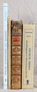 • HAEBLER (Konrad). Spanische und Portugiesische Bücherzeichen des XV. und XVI Jahrhunderts. Strasburg, Heitz, 1898 (Réimpression, 2011). Grand in-4, (3) ff + XL + 47 pp. + XLVII planches, cartonnage illustré de l'éditeur. Grand spécialiste des origines de la typographie dans la péninsule ibérique, le bibliographe allemand répertorie ici les marques d'imprimeurs et divers ornements typographiques qui sont reproduits sur 47 planches.