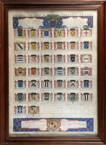 feuille in-plano encadrée (60 x 83 cm.) contenant 38 blasons gravés, coloriés et légendés.