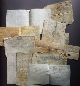 - Contrat d’obligation en faveur d’une dénommée Marie Chapol, maîtresse de poste de la ville d’Uzerche, sur une pièce de parchemin pliée en deux, mentions manuscrites en marges et au verso, le nom de la bénéficiaire est souligné au crayon rouge, parchemin jauni avec des marques de pliure et de découpage, 15 septembre 1773.