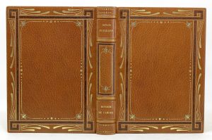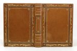 mêmes fers ainsi que le délicat encadrement de cuir mosaïqué, doublure en satin moiré brun argile encadrée par une large bande de cuir rehaussée à nouveau par des éléments du décor des plats et par la même mosaïque de maroquin, gardes de même satin que la doublure, tête dorée, couvertures et dos conservés, [rel. moderne] en parfait état. 100/180 €
