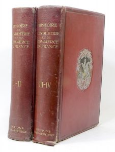 [INDUSTRIE]. Histoire de l’industrie et du commerce en France. L'effort économique français contemporain. Paris, Éditions d'art et d'histoire, 1926 ; 4 tomes en 2 forts vol. pet. in-folio, chagrin grenat, large motif allégorique en noir, or et...