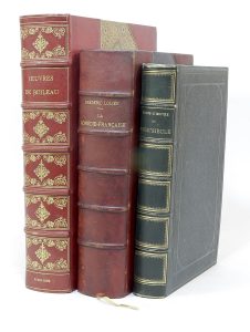 • BOILEAU-DESPRÉAUX. Œuvres poétiques. Paris, Hachette, 1889 ; in-4, demi-maroquin écarlate à coins, dos à nerfs orné de motifs dorés, tête dorée, couvertures et dos conservés, [rel. du début du XXe s.], coins très légèrement frottés.