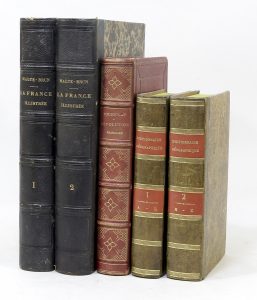 MALTE-BRUN (V. A.). La France Illustrée. Géographie, Histoire, Administration et Statistique. Paris, Gustave Barba, [1855] ; 2 vol. in-4, demi-chagrin noir, dos à nerfs, [rel. de l'époque]. 80/100 € Publication illustrée de figures gravées...