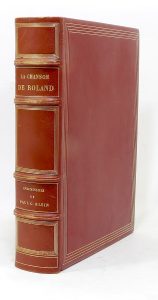 [ROLAND]. La Chanson de Roland. S. l., Paul Georges Klein, 1945 ; fort vol. gr. in-4, chagrin grenat, encadrement de quatre filets dorés sur les plats, dos à nerfs, encadrement de même chagrin avec quatre filets dorés aux contreplats, doublures...