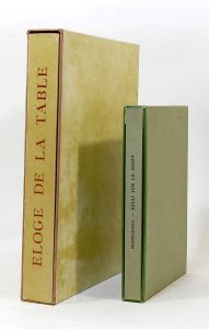SAINT-GEORGES (André). Éloge de la Table. Paris, Confrérie des Chevaliers du Tastevin, 1947 ; in-folio en ff., couverture illustrée, chemise demi-parchemin blanc et étui. 80/100 € Eau-forte originale d’Hervé Baille en frontispice et...