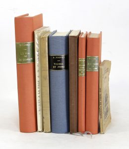 [VINS et LITTÉRATURE]. Ensemble de 8 ouvrages littéraires relatifs au vin et à la vigne.  ; 9 vol.. 80/100 € • PRADELS (Octave). Le Vin et la chanson. Paris, Flammarion, [vers 1910]. Premier plat de couverture conservé. Envoi autographe...
