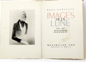 ANDERSEN (Hans). Images de la Lune, vues par Alexandre Alexeieff. Paris, Maximilien Vox, 1942 ; gr. in-4, en ff., couverture imprimée rempliée, chemise et étui. 150/250 € Belles aquatintes très noires d’Alexandre Alexeieff à pleine...