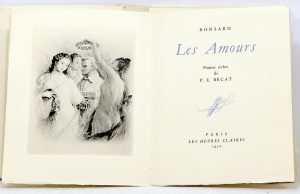 [BÉCAT (Paul-Émile)].— RONSARD (Pierre). Les Amours. Paris, les Heures Claires, 1950 ; pet. in-4, en ff., couverture imprimée rempliée, chemise et étui. 60/80 € Frontispice et 20 pointes-sèches en noir de Paul-Émile Bécat. Tirage...