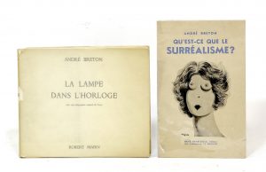 BRETON (André). La Lampe dans l’horloge. Paris, Robert Marin, 1948 ; in-8, broché, couverture verte illustrée et seconde couverture au format in-8 oblong rempliée, non coupé. 100/150 € Édition originale ornée d’un frontispice par...