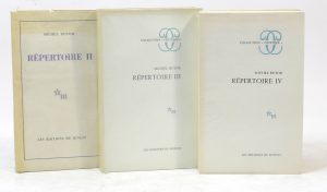 BUTOR (Michel). Répertoire II.— IV. Paris, Éditions de Minuit, 1964-1974 ; 3 vol. in-8, brochés, non coupés. 150/200 € Édition originale de chacun des volumes. Tous sont des exemplaires du tirage de tête : 34/60, 44/60 et 24/50 sur...