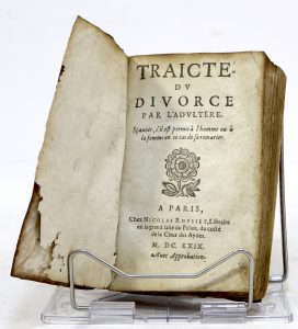 [DROIT]. Traicté du divorce par l’adultère. Sçavoir, s’il est permis à l’homme ou à la femme en ce cas de se remarier. Paris, Nicolas Rousset, 1629 ; in-12, parchemin roux, titre manuscrit au dos, [rel. de l'époque], un peu...