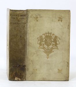 FRONTINUS (Sextus Julius). Libri quatuor Strategematicon cum notis integris Francisci Modii […]. Lugduni Batavorum [Leyde], S. Luchtmans, 1731 ; pet. in-8, parchemin crème, encadrements de filets à froid avec glands dorés aux angles et armes...