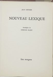 GRENIER (Jean). Nouveau lexique. Montpellier, Fata Morgana, 1969 ; pet. in-4, en ff., couverture vieux rose imprimée rempliée. 100/150 € Frontispice estampé d’Étienne Hajdu. Édition originale. Tirage limité à 350 exemplaires...