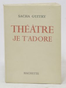 GUITRY (Sacha). Théâtre je t’adore. Paris, Hachette, 1958 ; in-8, broché, en partie non coupé. 120/150 € Édition originale. Ouvrage illustré de nombreux croquis hors texte de l'auteur. Tirage limité à 110 exemplaires numérotés sur...