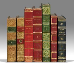 39 volumes in-8, basane racinée, roulette dorée, dos lisse richement orné, pièces de titre rouge et de tomaison verte, tranches marbrées (Reliure de l’époque).