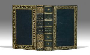 3 volumes in-8, maroquin bleu à long grain, bordure dorée décorée d’un pampre, dos orné avec décor aux mille points dans les caissons, double roulette et double filet intérieur dorés, doublure et gardes de moire rose, tranches dorées (Bozerian).