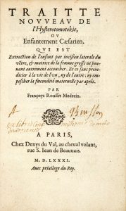 ► ÉDITION ORIGINALE DE CE REMARQUABLE TRAITÉ OBSTETRICAL, PREMIER LIVRE SUR L'OPÉRATION DE LA CÉSARIENNE, dû à François Rousset, médecin exerçant à Paris dans la seconde moitié du XVIe siècle.