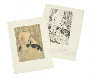 Superbe édition illustrée de 50 compositions de Sylvain Sauvage gravées à l’eau-forte en deux teintes avec la collaboration de Paul Haasen. Elles sont toutes de grandes compositions se répartissant en 2 frontispices, 2 vignettes de titre, 5 têtes-de-chapitre, 39 dans le texte et 2 culs-de-lampe. Le texte, imprimé par Pierre Bouchet, est par ailleurs agrémenté d’ornements en noir. Tirage à 175 exemplaires sur Montval, celui-ci un des 10 exemplaires d’auteurs, ici enrichi d’une suite en noir des gravures, du dessin original du frontispice du premier tome, du specimen et d’un faire-part de dîner du Syndicat de la librairie ancienne et moderne du 15 mai 1929 avec une eau-forte de Sauvage. Envoi autographe signé de Sylvain Sauvage à Monsieur et Madame Paul Haasen sur le feuillet de justification et sur le menu. Chemise et étui un peu usés.