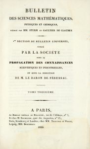 GALOIS (Évariste), CAUCHY, FOURIER, CHEVREUL et AVOGADRO. — Bulletin des sciences mathématiques, physiques et chimiques [...] publié sous la direction de M. le Baron de Férussac. Tome treizième. Paris, Firmin Didot, 1830.